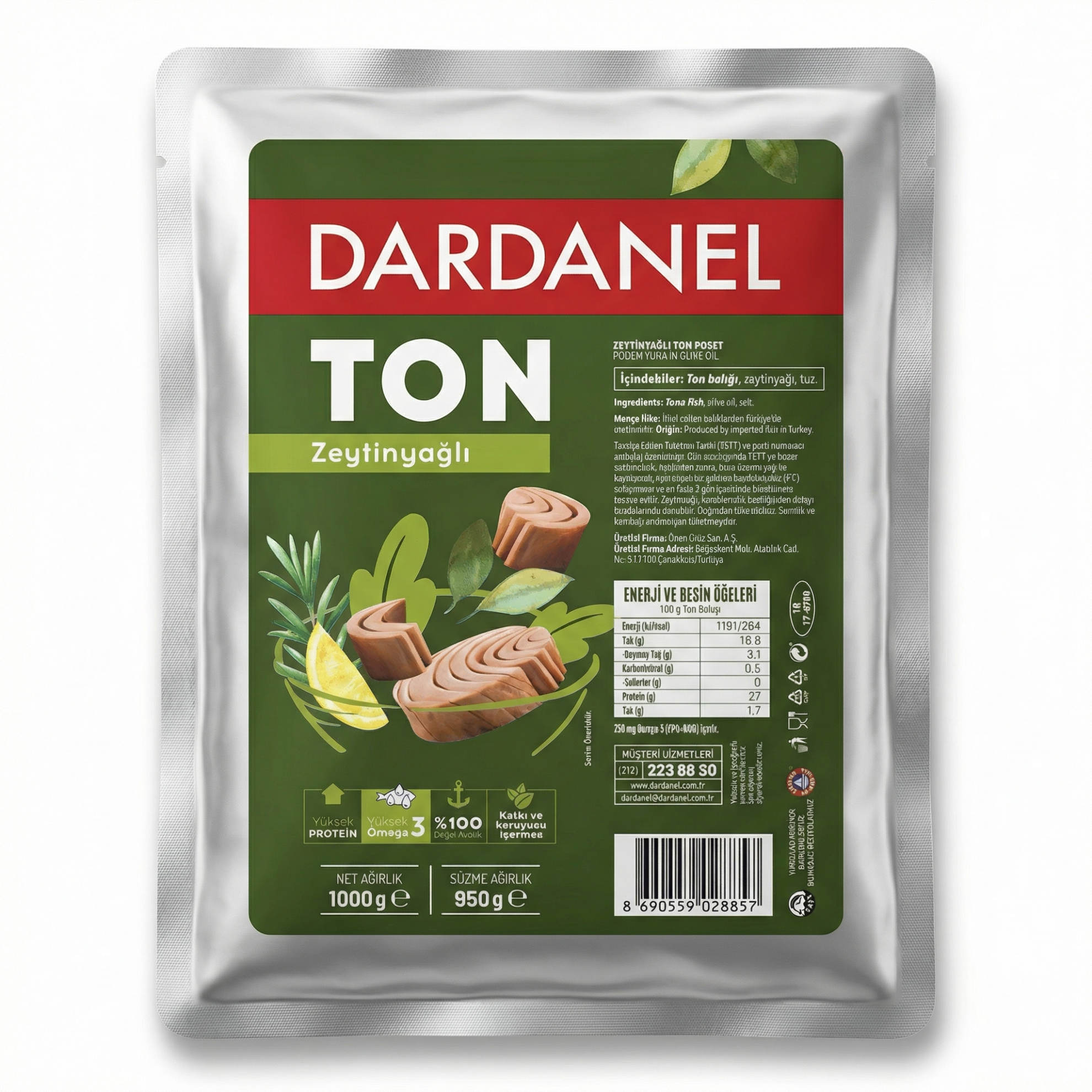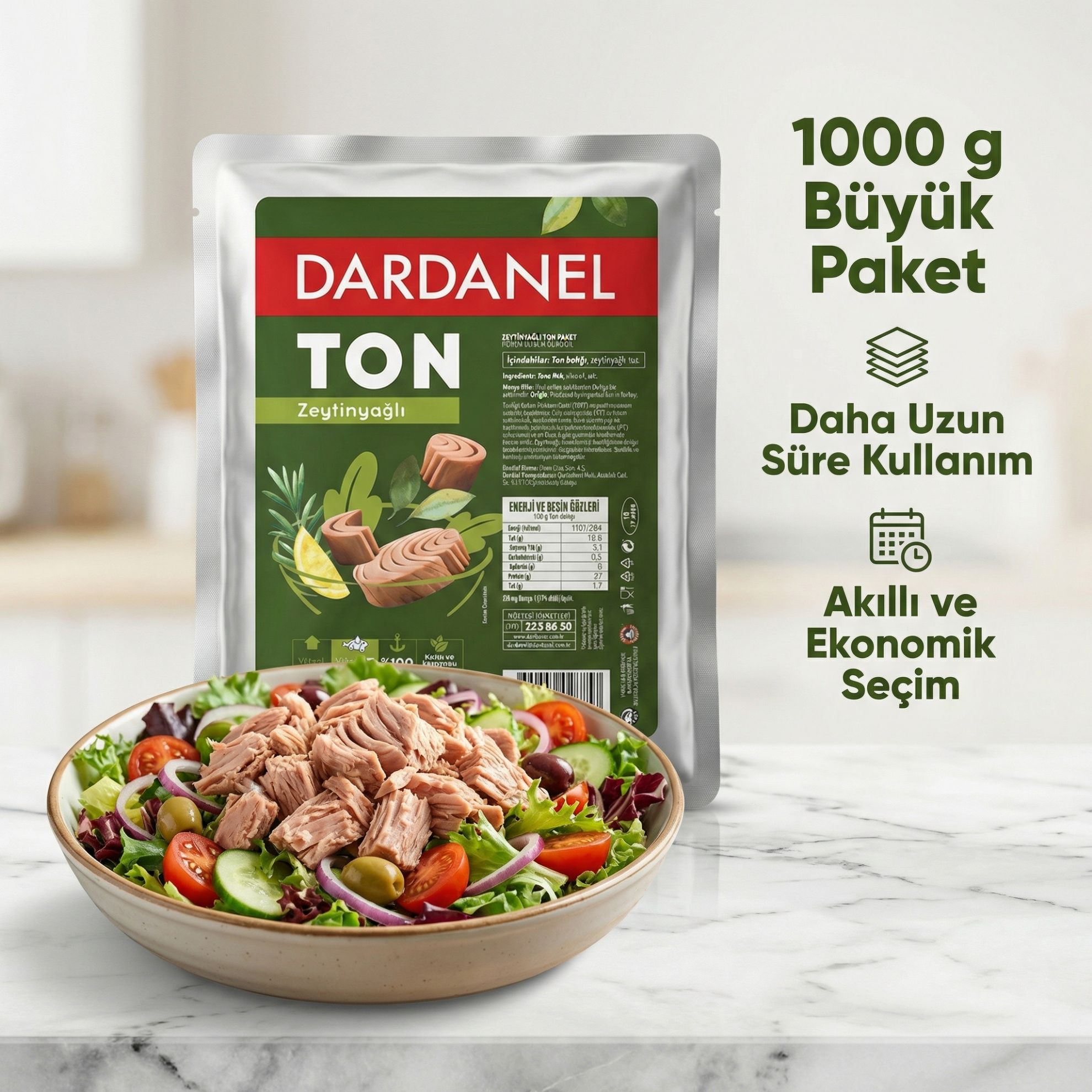 Türkiye’nin en güvenilir deniz ürünleri markalarından Dardanel, profesyonel mutfaklara özel geliştirdiği büyük boy ton balığı ile pratik ve lezzetli bir çözüm sunar. Zeytinyağı ile hazırlanmış ton balığı, doğal aroması, yumuşak dokusu ve yüksek protein içeriği ile hem soğuk hem de sıcak tariflerde rahatlıkla kullanılabilir. 1 kg’lık büyük boy ambalajı sayesinde restoran, kafe, otel mutfakları ve toplu tüketim noktaları için ideal bir tercihtir.